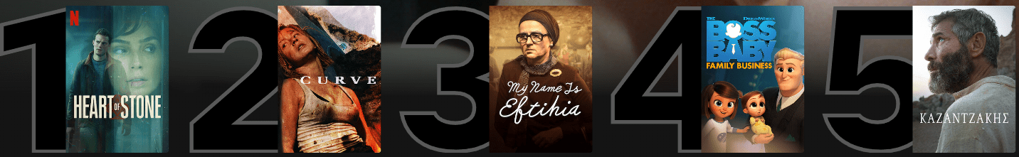 Στην κορυφή βρίσκεται η ταινία Heart of Stone με πρωταγωνίστρια την Gal Gadot. Ακολουθούν το θρίλερ Curve και η ταινία The Boss Baby: Family Business.