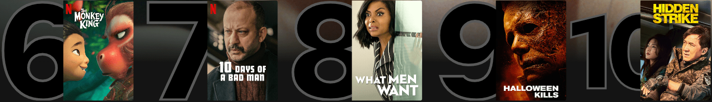 Στην 6η θέση βρίσκεται η ταινία The Monkey King, και μετά ακολουθούν οι 10 Days of a Bad Man, What Men Want, Halloween Kills και Hidden Strike.