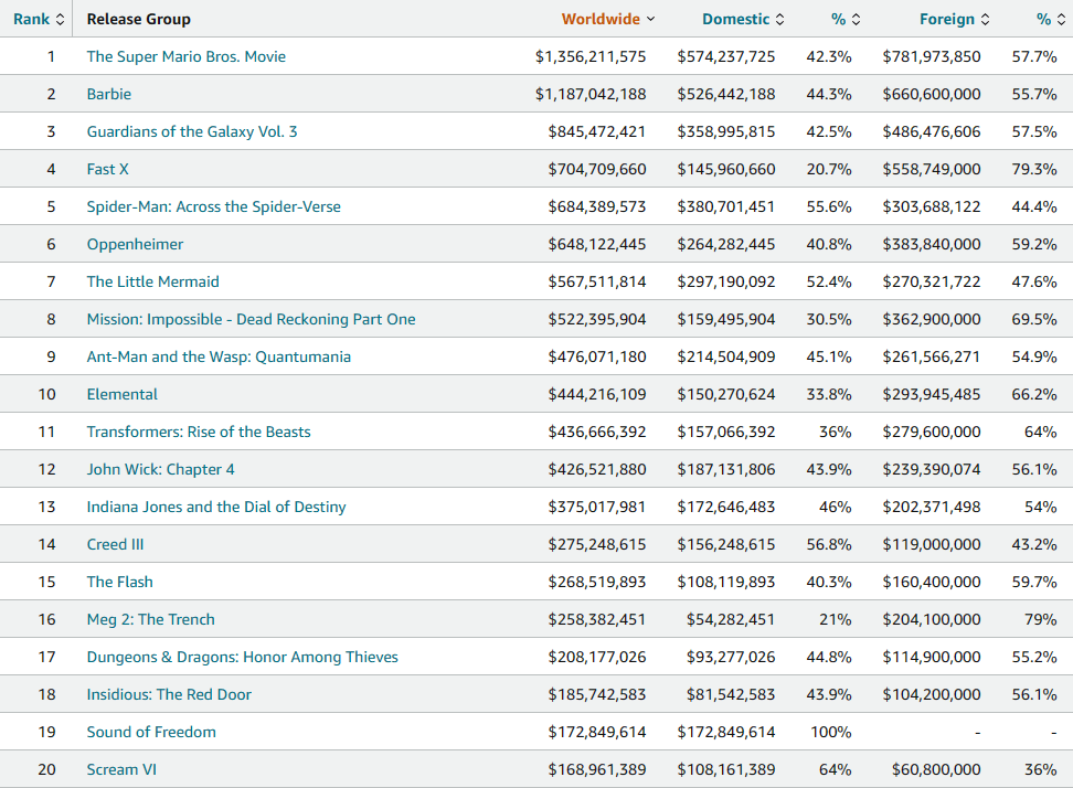Η πρώτη ταινία σε παγκόσμιο επίπεδο, όσον αφορά το box office, είναι το The Super Mario Bros. Movie των Universal Pictures, Illumination και Nintendo. Η ταινία έχει καταφέρει να κρατήσει την πρώτη θέση για πολλούς μήνες, ενώ στη δεύτερη θέση βρίσκεται η ταινία Barbie με την Margot Robbie και τον Ryan Gosling.