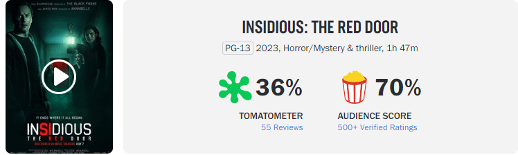 Η νέα ταινία τρόμου “Insidious: The Red Door” δεν φαίνεται να έχει πείσει τους κριτικούς. Το Rotten Tomatoes τη βαθμολογεί με 36% μέχρι στιγμής, ενώ τα δύο προηγούμενα κεφάλαια της σειράς είχαν αντίστοιχα 66% και 57%. Ωστόσο, το κοινό της ταινίας της δίνει 70%.