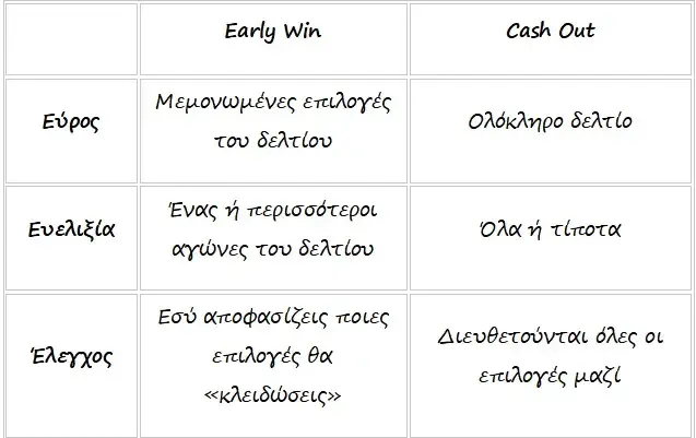 Η διαφορά του Early Win με το Cash Out είναι ότι το Early Win «κλείνει» μία επιλογή μέσα στο δελτίο, ενώ το Cash Out «κλείνει» ολόκληρο το δελτίο. Και τα δύο, ωστόσο, μπορούν να χρησιμοποιηθούν στο ίδιο στοίχημα, αν είναι διαθέσιμα.